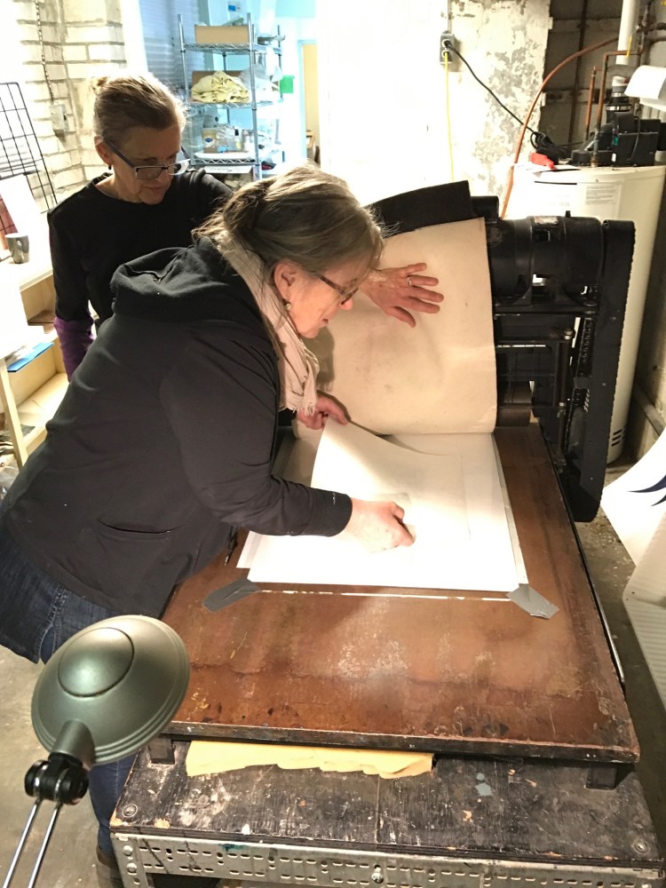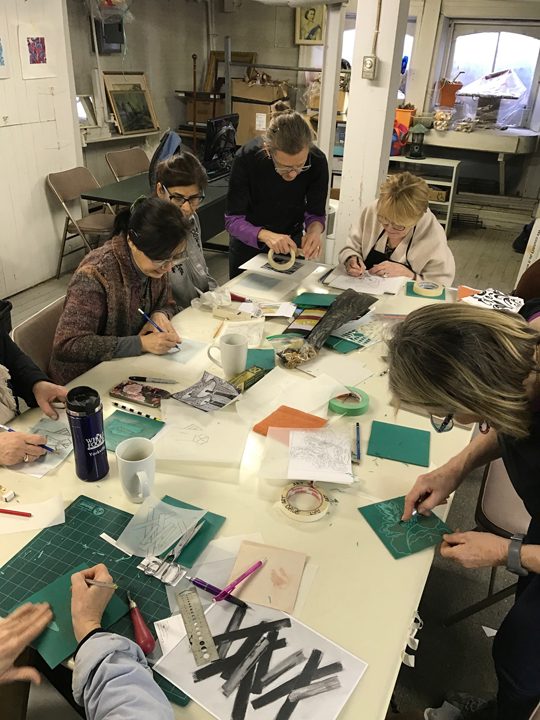 PRINTMAKING WORKSHOPS: Two weekend workshops introduced printmaking to members using an automated etching press donated by a member a few years earlier. Colour relief prints made with hand cut linocut plates on japanese papers were puzzling at first but everyone soon got hold of the process. Thereafter we shared weekly one day open print sessions allowing all to continue their experiments and explorations. Soon someone suggested a print show.