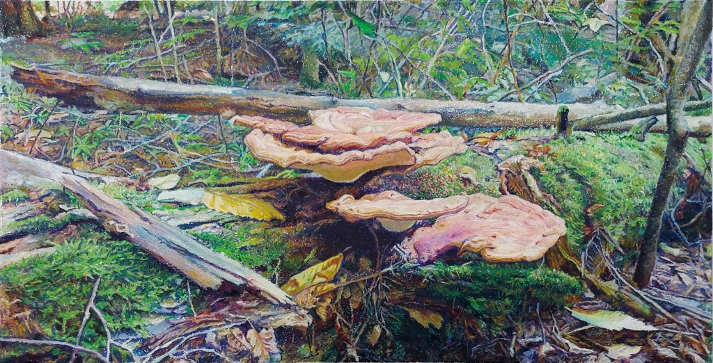 Once in a while this happens. Someone close was asking what to put on their walls. I suggested that we look at their photos and whichever they choose I would work from it. That’s MORNING IN THE WOODS (top left) and FUNGI (top right). The medium is oil pastel on textured canvas.